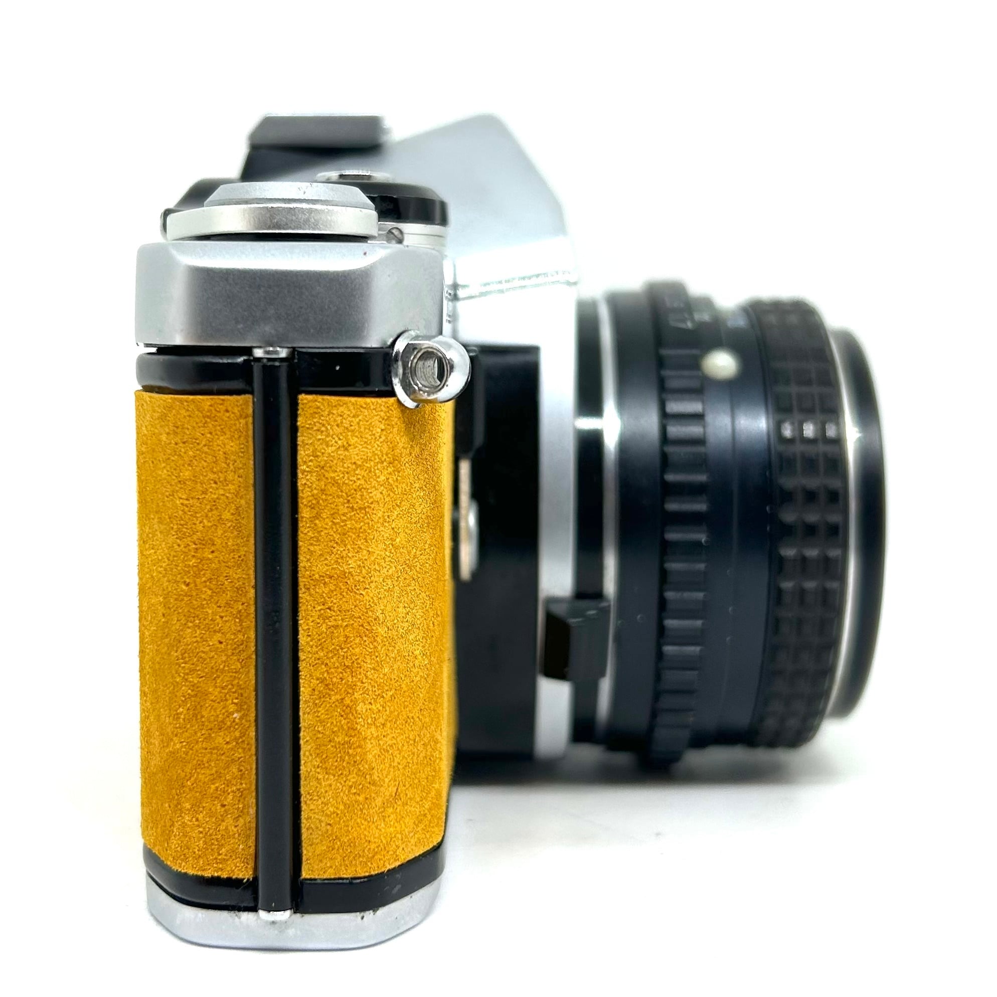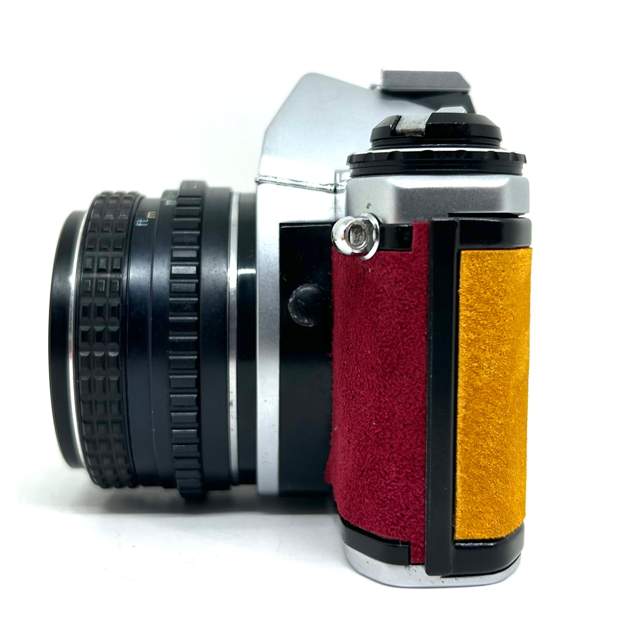 1、フィルムカメラを修理•調整して、表皮をスエードに貼り替えてリメイクしております。