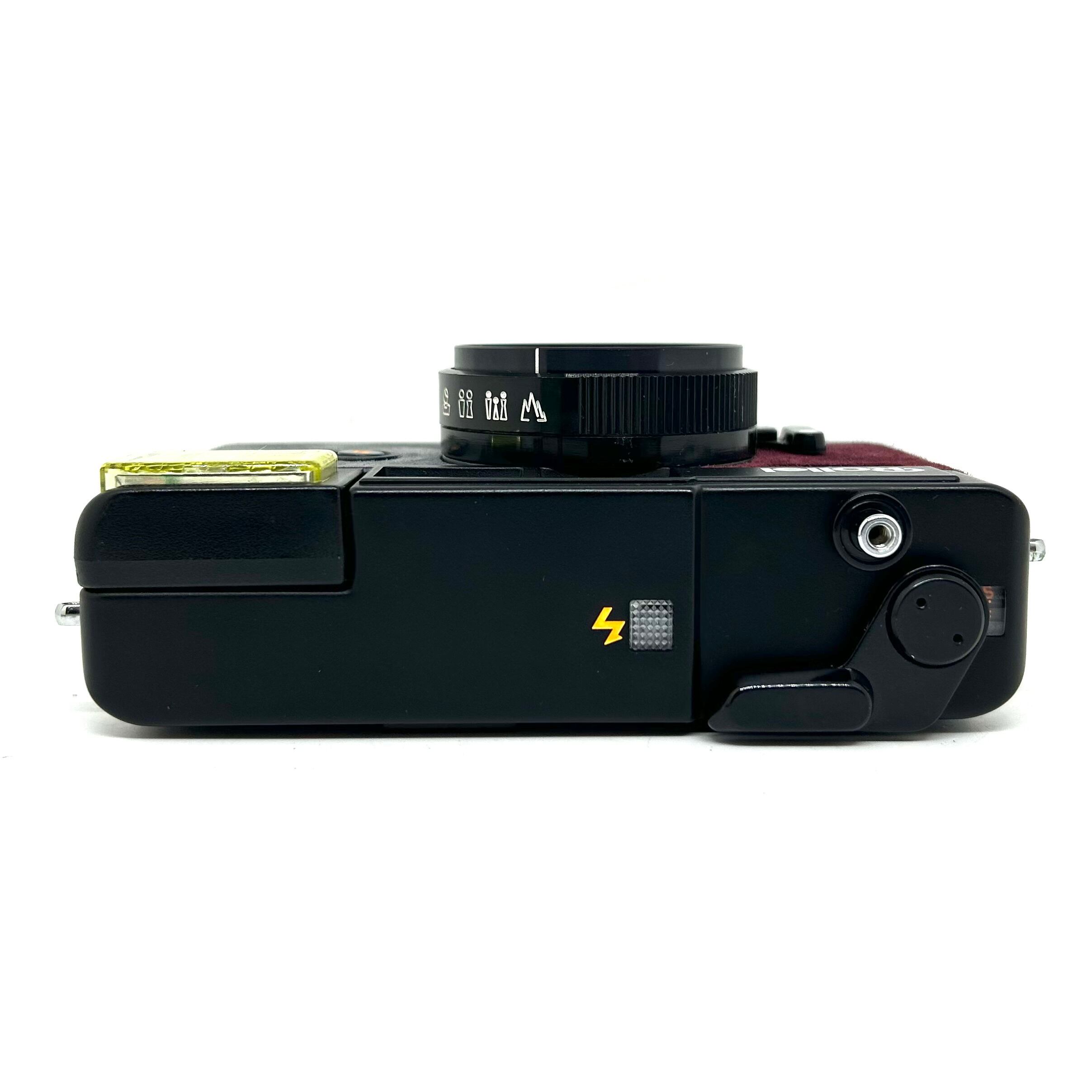 ポップアップストロボ内蔵のプログラムEEカメラ。4点ゾーンフォーカス。ファインダー内に